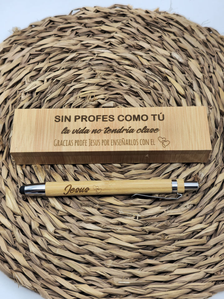 Cajita de bambú personalizada con bolígrafo de bambú personalizado! Ideal para regalar a los profes!