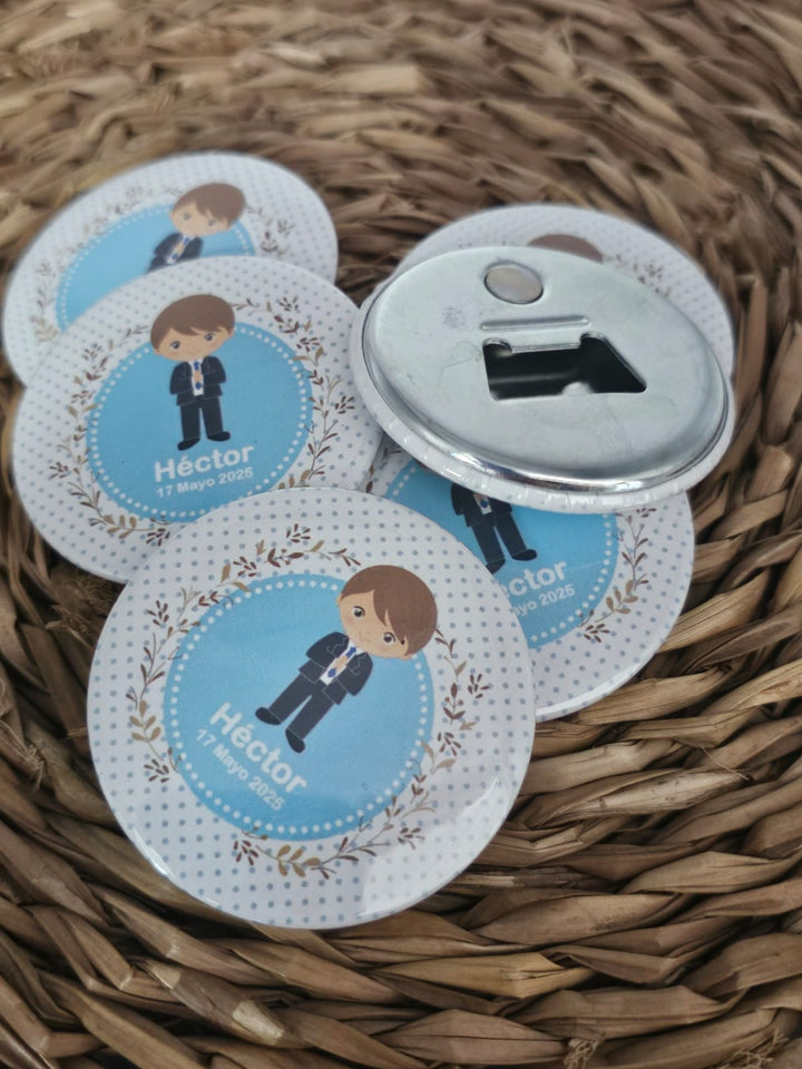 ¡Olvídate de los aburridos recuerdos de boda ! Con nuestras chapas de 58mm personalizadas, ¡tus invitados se llevarán un pedacito de la fiesta que nunca olvidarán! Abridor con Imán para la nevera.