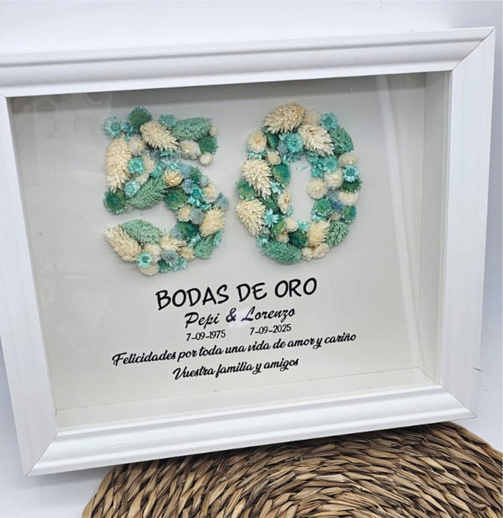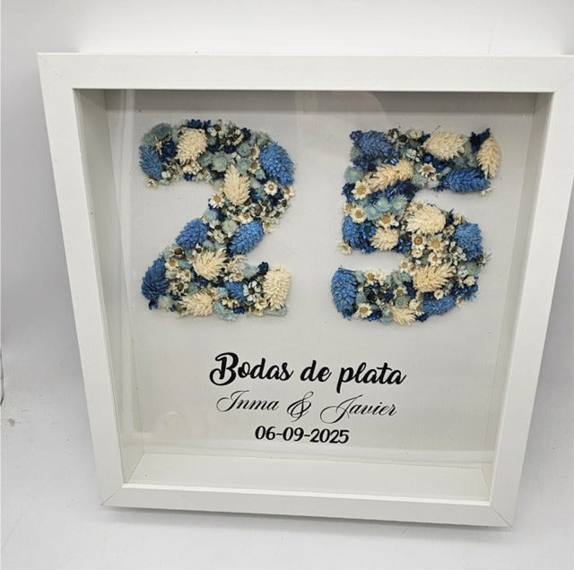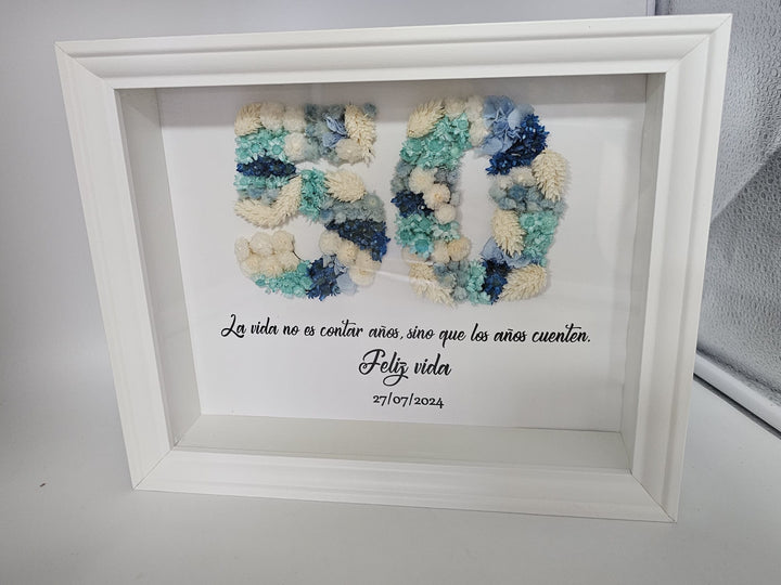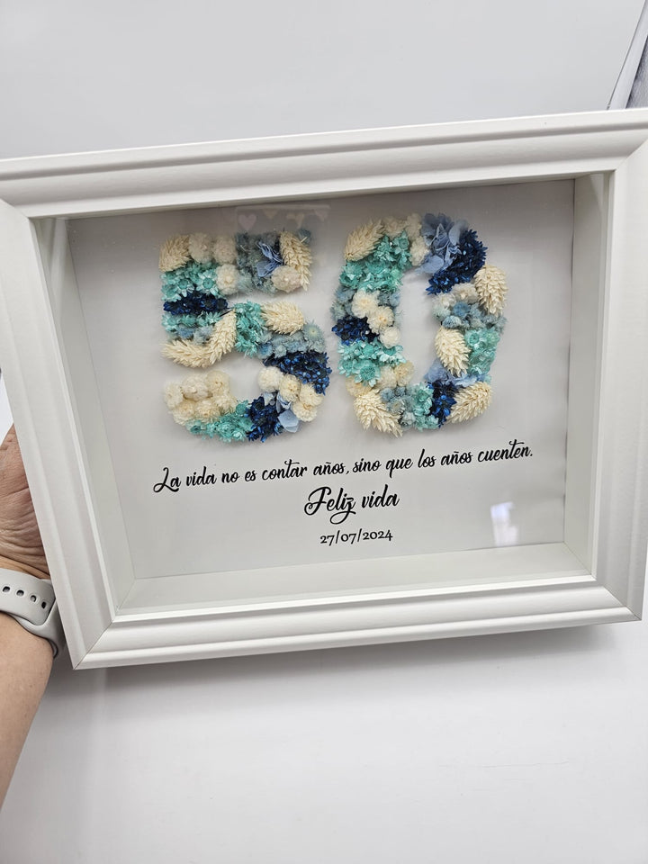 Cuadro en color blanco, de número con flores preservadas y dedicatoria. Medida del cuadro 20x25cm. Ideal para regalar en cualquier ocasión.
