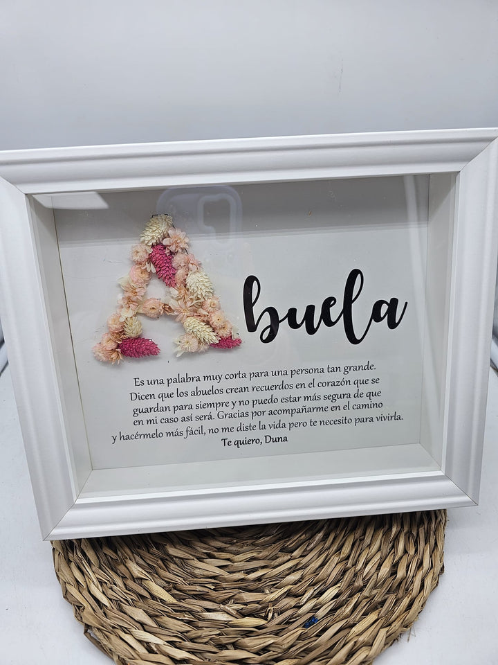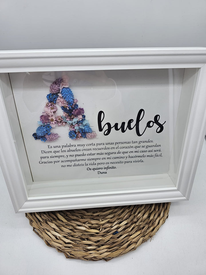 Cuadro con la palabra abuelos o abuela ideal para regalar a esos abuelos que tanto queremos. Está echo con flores preservadas y puedes personalizar tanto la dedicatoria como el color de las flores. Medida 20x25cm.