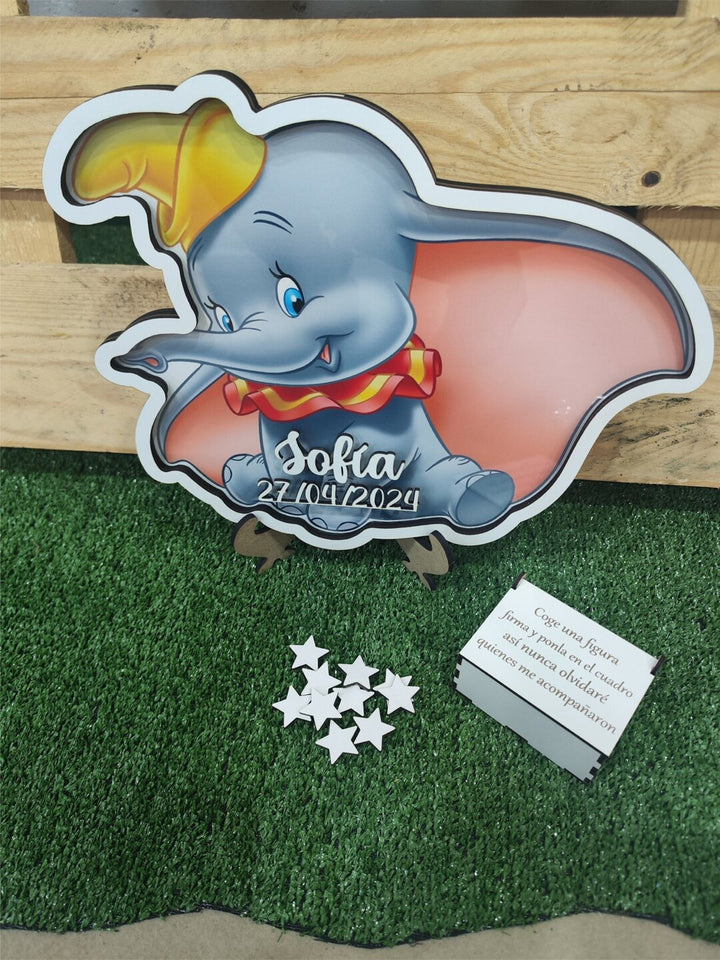El cuadro de firma Dumbo es perfecto para tu evento. Tus invitados podrán firmar una ficha y colocarla en el cuadro, creando un recuerdo único y especial. Con un tamaño de 35,5x29cm, trae 70 fichas para que todos tus seres queridos puedan dejar su huella. Una pieza única para siempre.