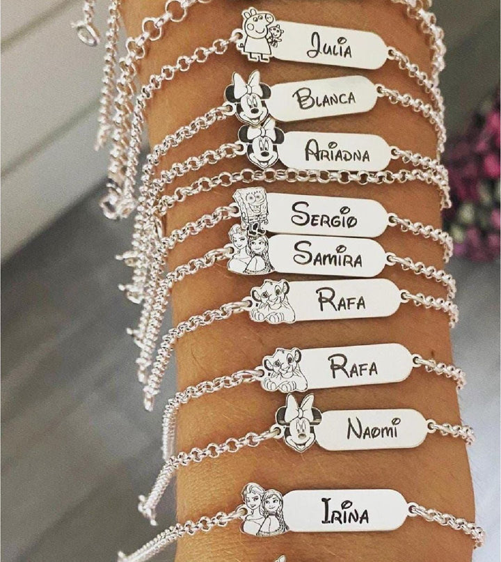 Esclava en plata de ley con nombre y tú personaje favorito. Ideal para hacer un regalito en comuniones, cumpleaños o en cualquier ocasión.