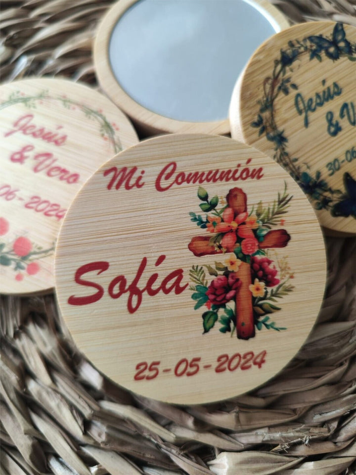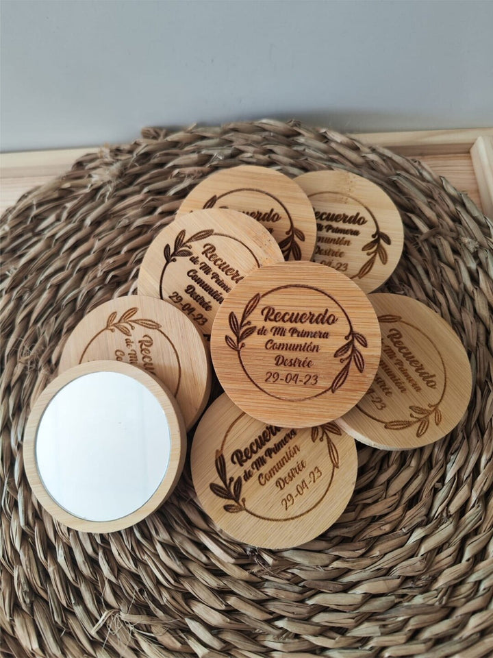¡Prepárate para una lluvia de "¡guau!" con estos espejos de bambú grabados a láser! Son el regalo perfecto para tus invitadas, porque a quién no le gusta verse bien (y verse bien en un espejo chulísimo).