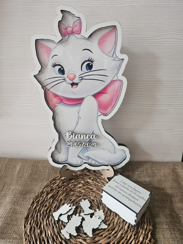 El cuadro de firmas de Gatita Marie es perfecto para tu evento. Tus invitados podrán firmar una ficha y colocarla en el cuadro, creando un recuerdo único y especial. Con un tamaño de 25,5x37cm, trae 70 fichas para que todos tus seres queridos puedan dejar su huella. Una pieza única para siempre.
