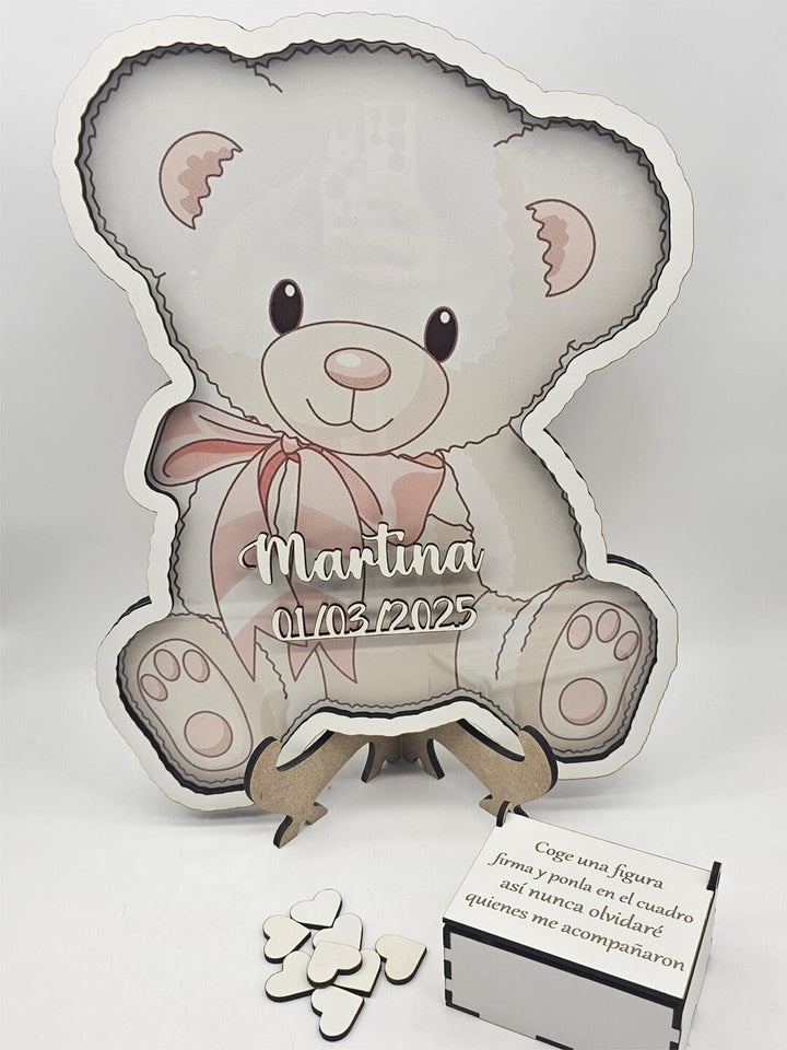 El cuadro de firmas de osito es perfecto para tu evento. Tus invitados podrán firmar una ficha y colocarla en el cuadro, creando un recuerdo único y especial. Con un tamaño de 29x36,5cm, trae 70 fichas para que todos tus seres queridos puedan dejar su huella. Una pieza única para siempre.
