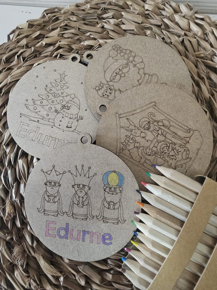 Este divertido pack de Navidad incluye 4 bolas de madera para colorear, de las cuales 3 se personalizan con el nombre que quieras, y una caja con 12 lápices de colores para darles vida. Perfecto para que los peques den rienda suelta a su creatividad mientras preparan la decoración navideña más original y personalizada. ¡Una actividad que hará brillar la magia de la Navidad en casa!