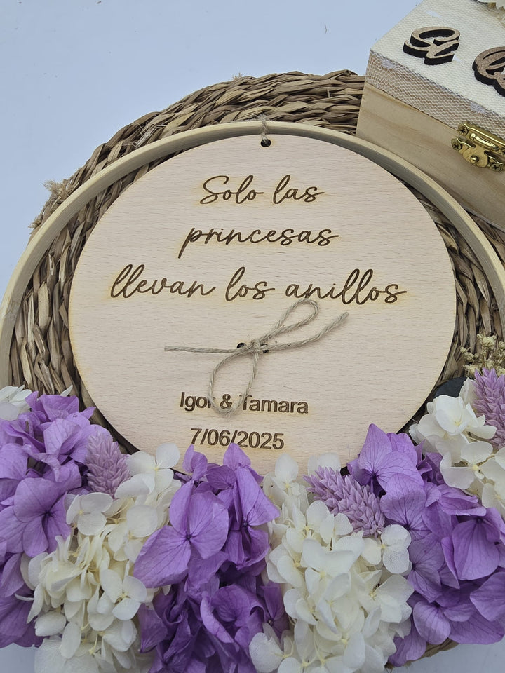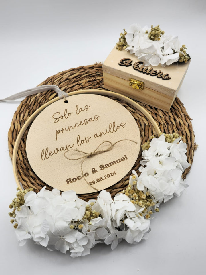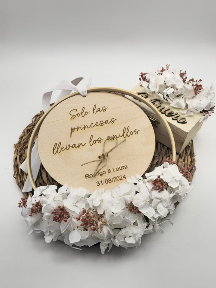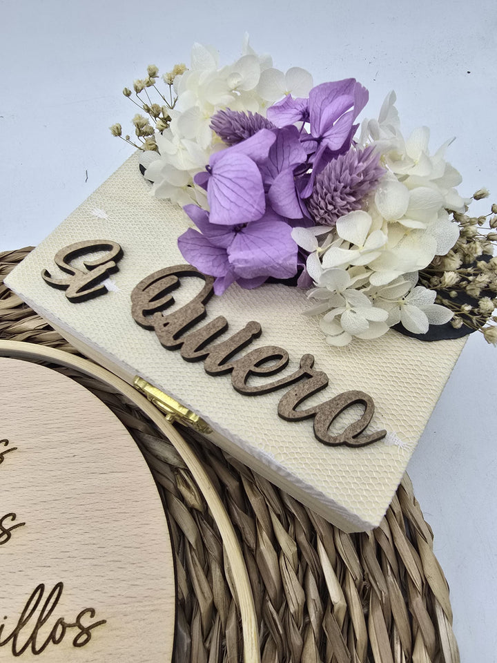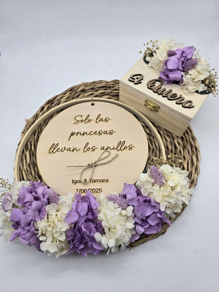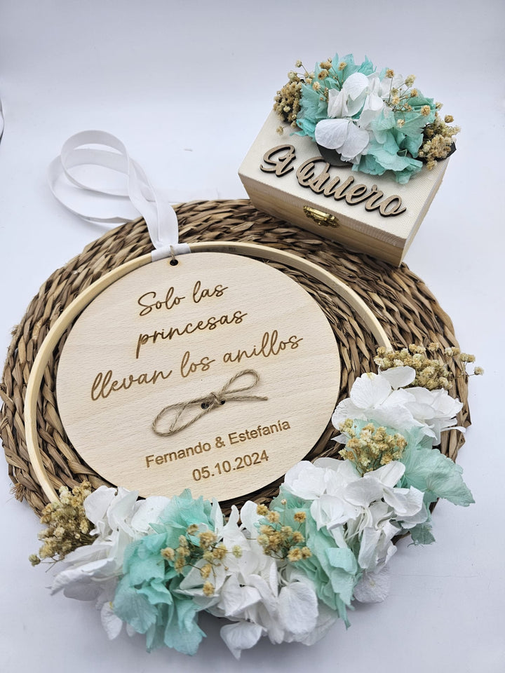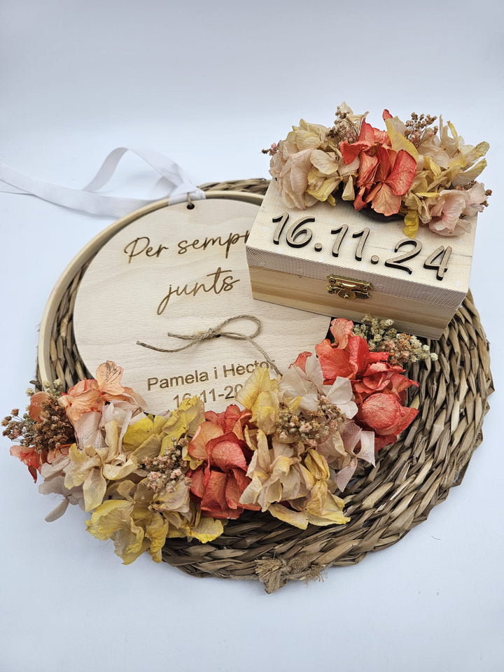 Pelota alianzas y cajitas para arras con flores preservadas. Ideal para ese día tan especial como es el día de tu boda... Además se personaliza como quieras, ya sea en color o frase.