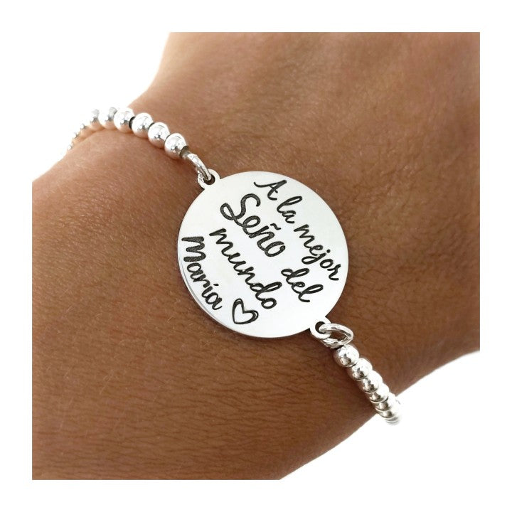 Pulsera plata de ley 925 cadena bolas ( 3mm ) de 17 cm largo + cadena adaptable de 2.5 cm con disco ( 21mm ) mensaje " A la mejor Seño del mundo " con nombre personalizado . Los artículos personalizados tienen un plazo de entrega de 15 días hábiles .