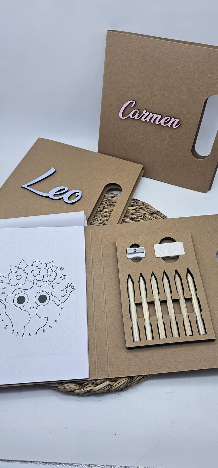 Divertido conjunto de dibujos y lápices de colores en una práctica carpeta con asas. Incluye: