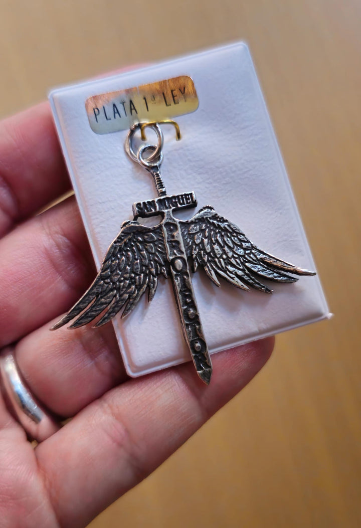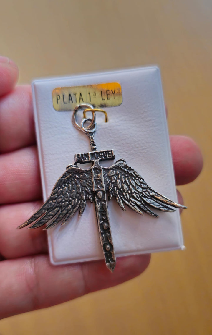"Este colgante en plata de ley representa la poderosa espada del Arcángel San Miguel, símbolo de justicia divina, protección y fuerza espiritual.
