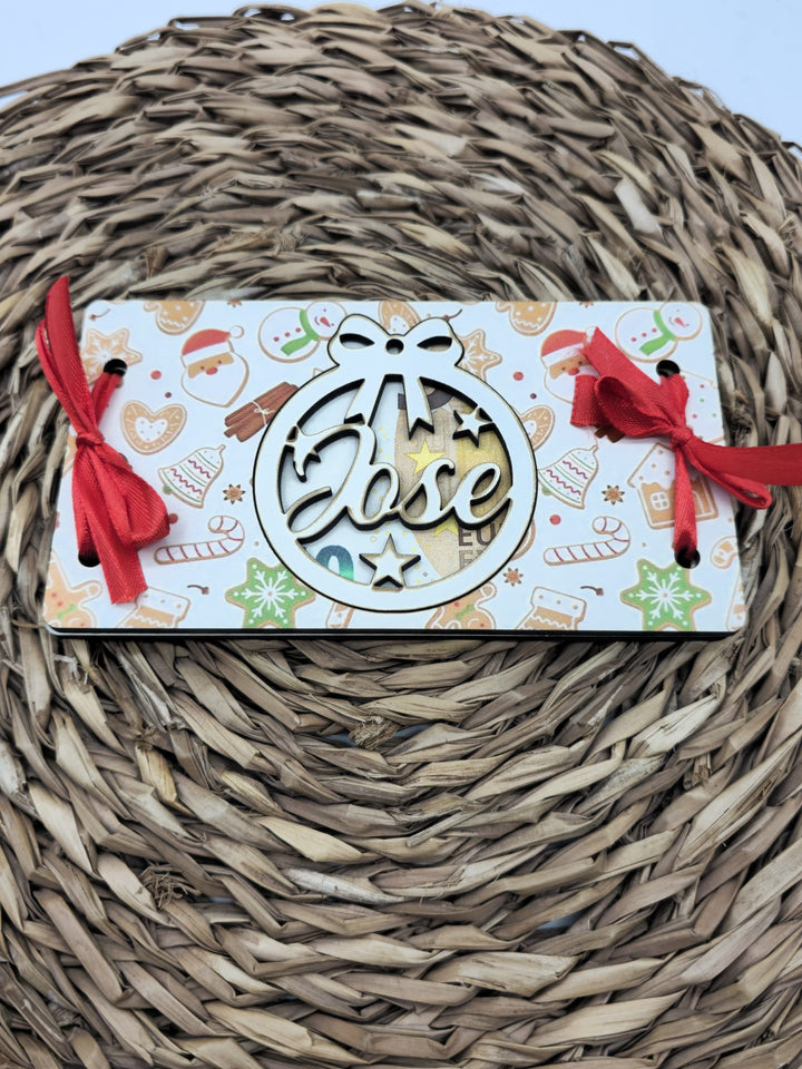 Este sobre para meter dinero es el detalle perfecto para sorprender en Navidad. Fabricado en madera y con un colorido diseño de Papá Noel, incluye una bola en el centro personalizada con el nombre, ideal para colgar en el árbol. Mide 14,5 x 8 cm, un regalo divertido y original que hará brillar la tradición navideña. (Billete no incluido)