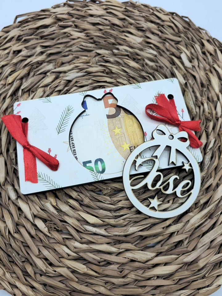 Este sobre para meter dinero es el detalle perfecto para sorprender en Navidad. Fabricado en madera y con un colorido diseño de navidad, incluye una bola en el centro personalizada con el nombre, ideal para colgar en el árbol. Mide 14,5 x 8 cm, un regalo divertido y original que hará brillar la tradición navideña. (Billete no incluido)